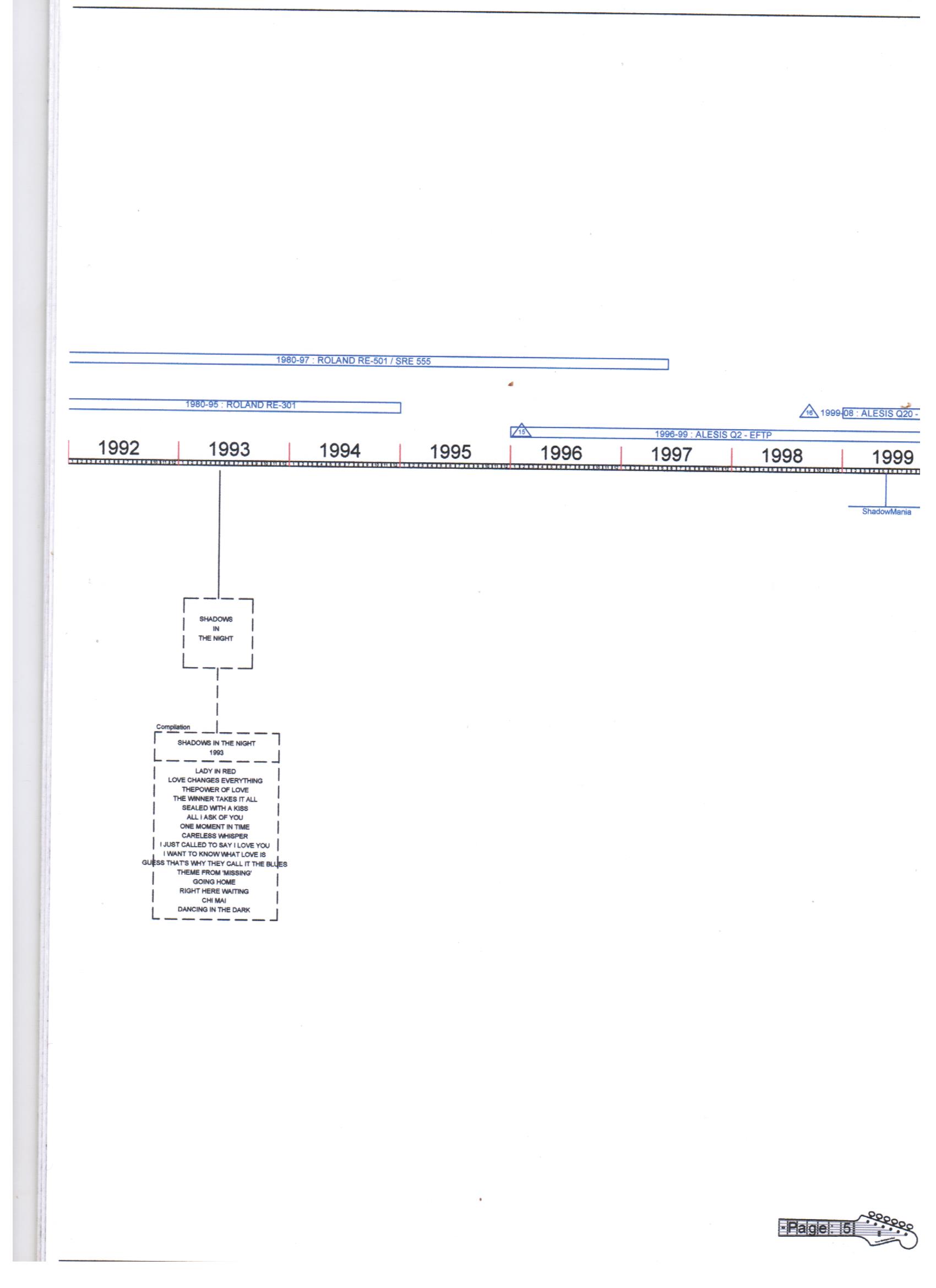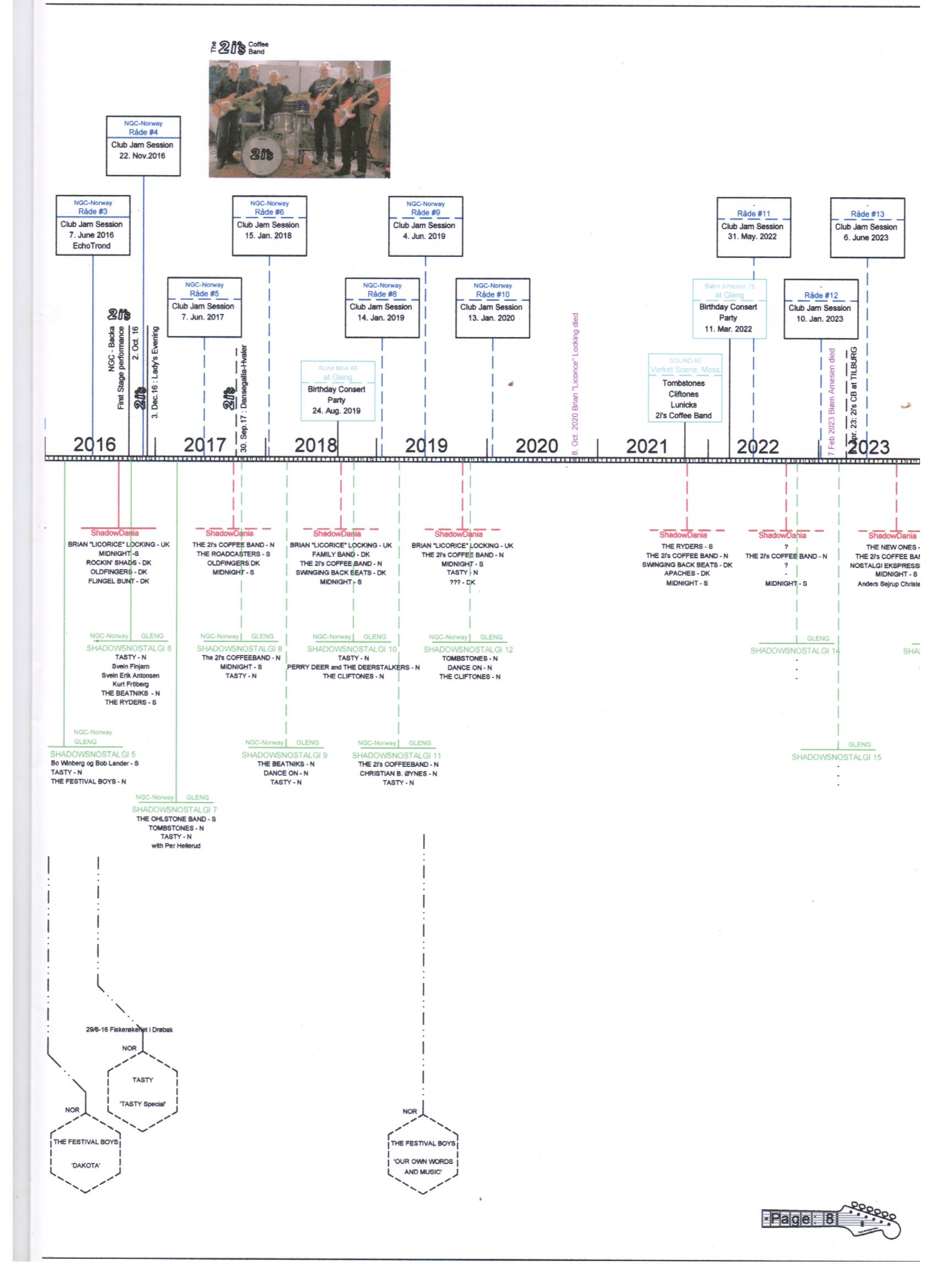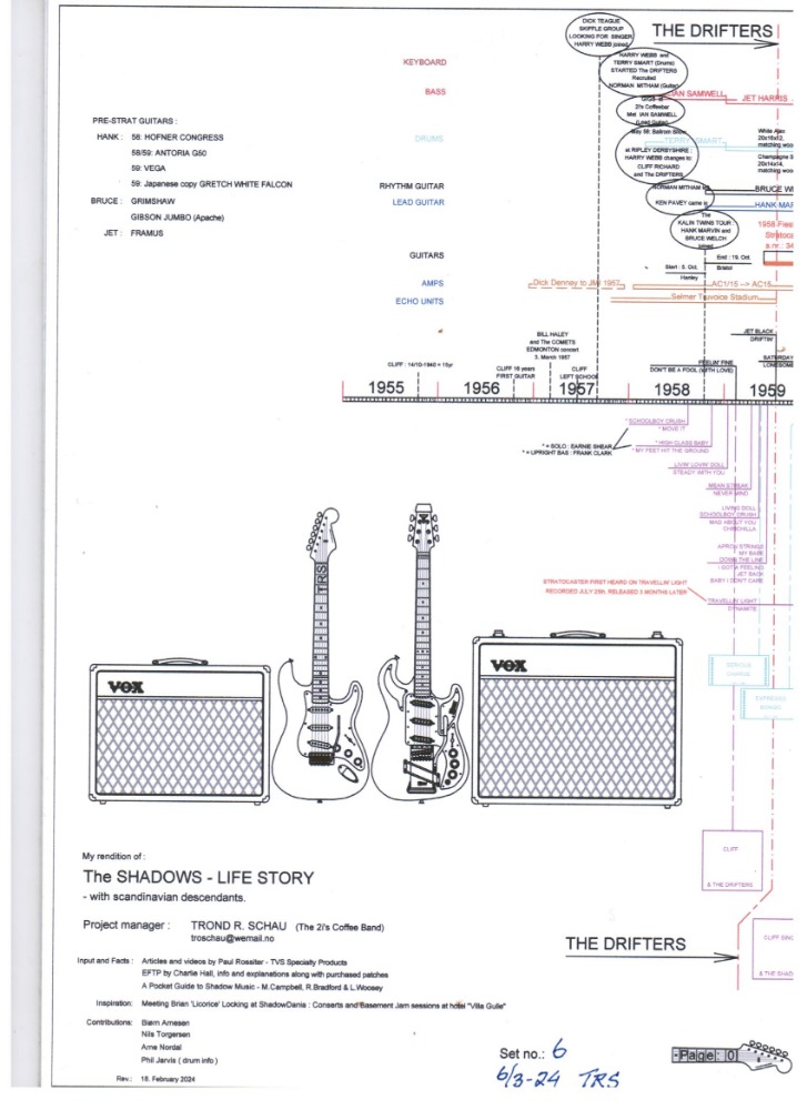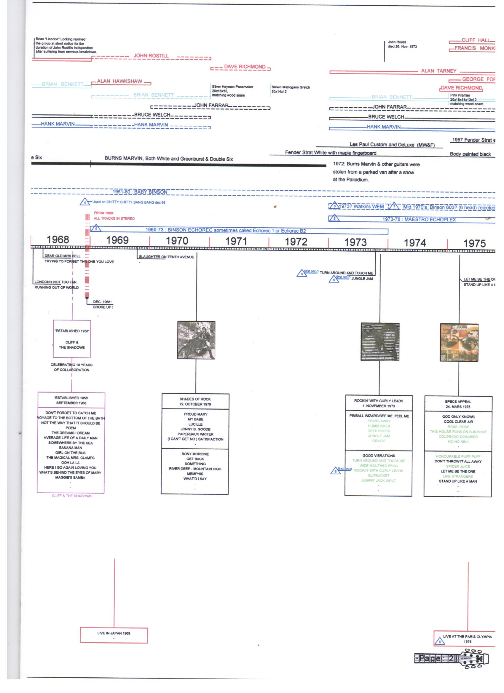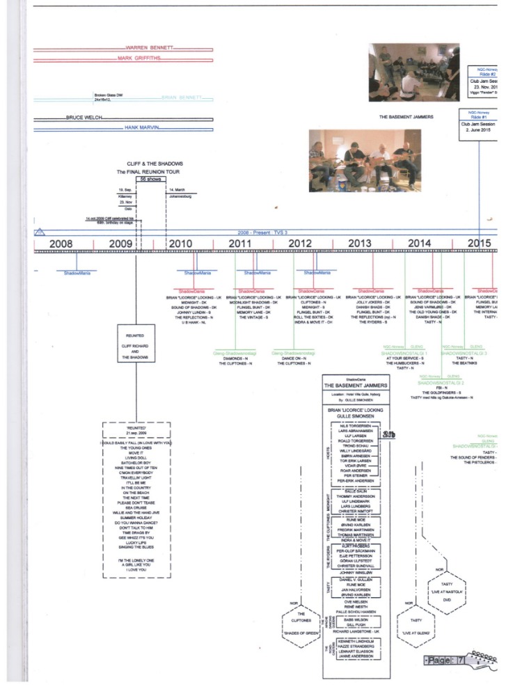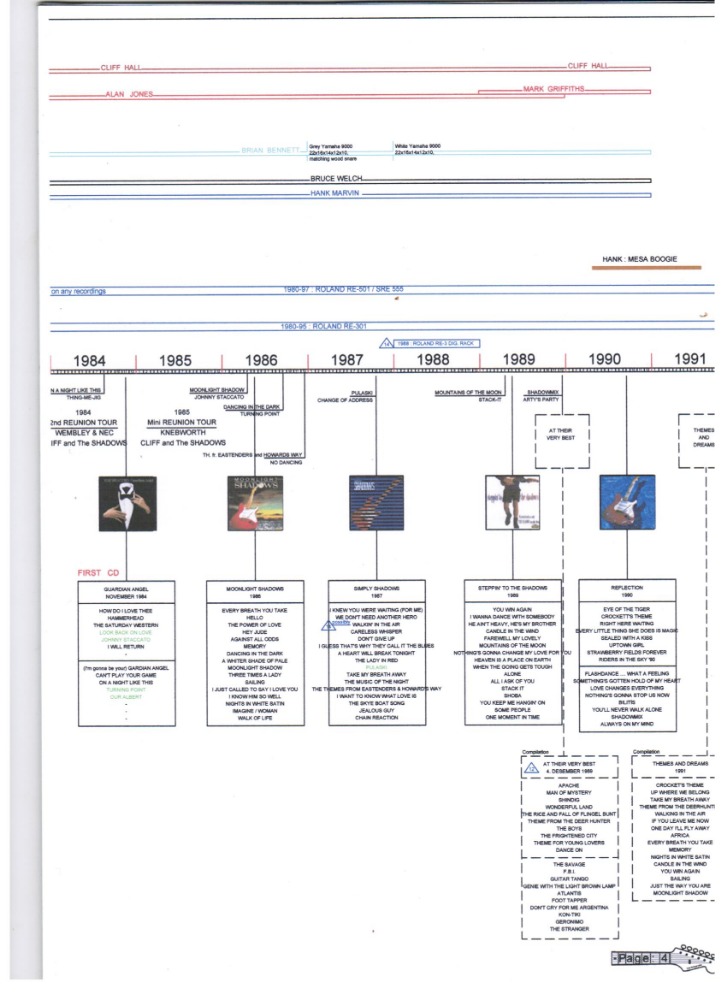 This article features a graphic timeline and overview of The Shadows' career. It includes mention of the group's members, their UK singles, EPs and albums releases, those with Cliff Richard and the equipment used by the group over the years. From 2010 on, also a summary of various tribute groups and events is given. The feature has been divided into 10 pages.